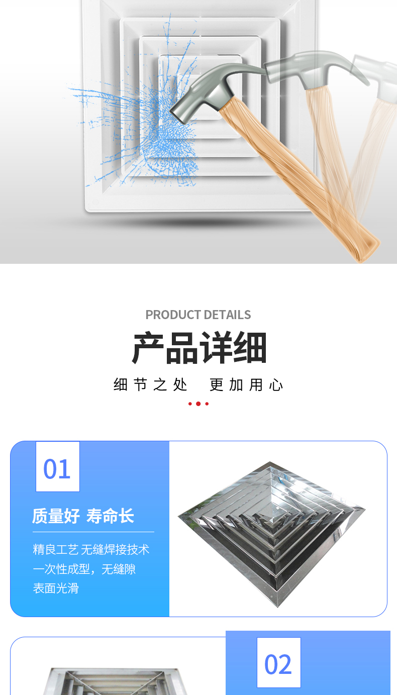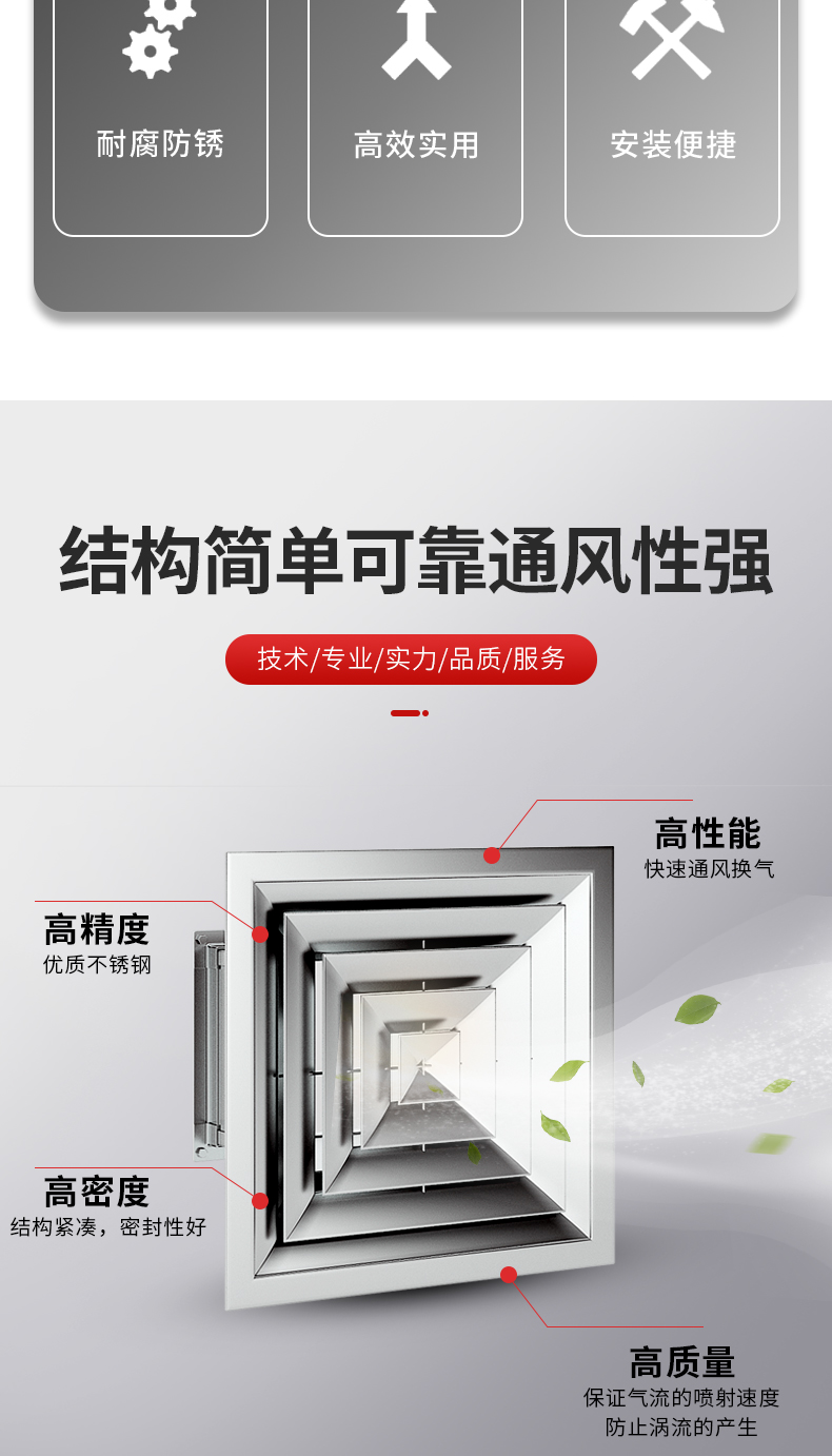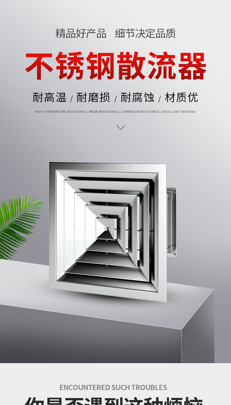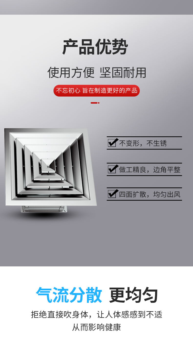 氣流型為貼附(平送型) 適用于吊頂送風系統 按性能確定頸部的風速,還需考慮安裝的高度及場合 中間葉片蕊可拆卸,便于安裝調試 尺寸由用戶選定